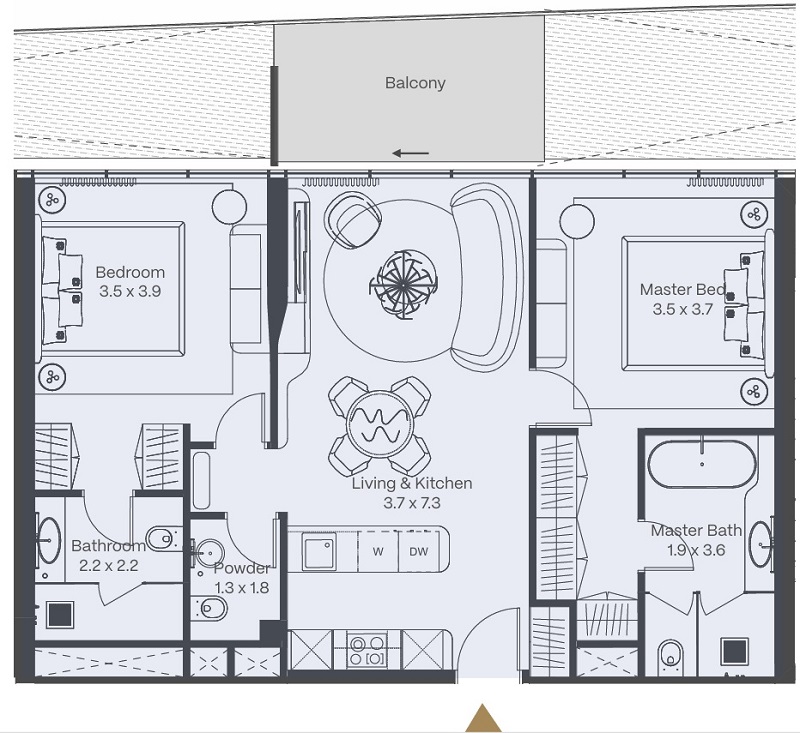 - Master yataq otağı (3.5 x 3.7) — özəl sanitar qovşağı ilə (1.9 x 3.6)