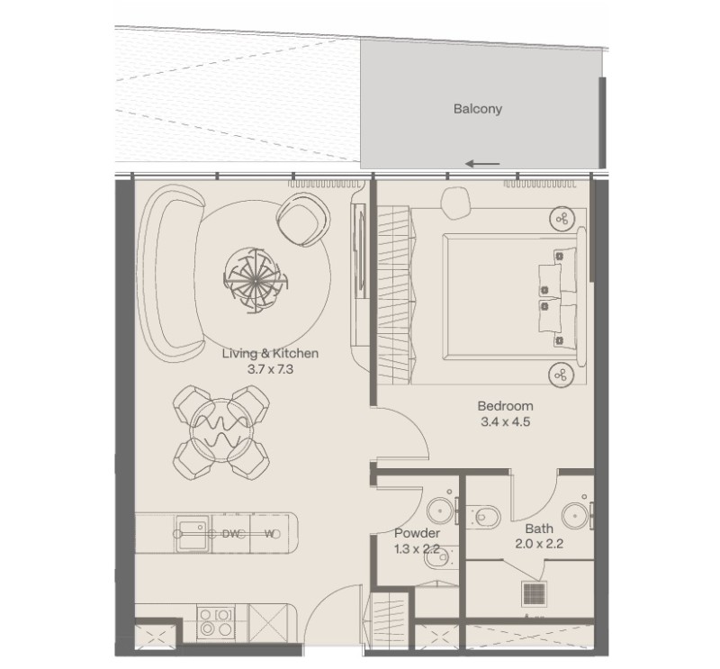 • Layout: living room, separate bedroom, kitchen, spacious balcony, 2 bathrooms